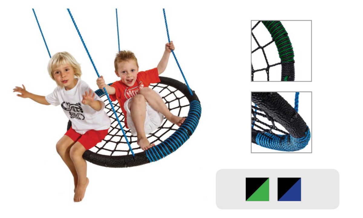 This has been designed to allow two small children to sit and swing together at the same time, with both legs on the nest and a view from above to the ground directly below them, or the option to sit on the edge of the nest with their feet and legs hanging freely towards the ground. while supplying a sense of comfort and security.